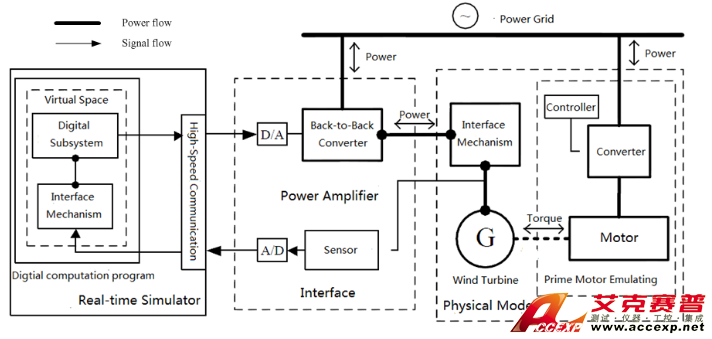為此希望搭建一套功率硬件在環(huán)的仿真試驗(yàn)平臺(tái),用以測(cè)試雙饋發(fā)電機(jī)組有功頻率控制器的相關(guān)控制性能。功率硬件在環(huán)試驗(yàn)平臺(tái)中有實(shí)際的物理裝置也有電力系統(tǒng)實(shí)時(shí)仿真器,它能結(jié)合真實(shí)物理裝置和實(shí)時(shí)仿真各自的優(yōu)點(diǎn)。