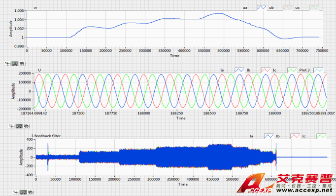 通過(guò)在實(shí)時(shí)仿真系統(tǒng)中設(shè)置不對(duì)稱(chēng)故障從而在風(fēng)電機(jī)組接入點(diǎn)處產(chǎn)生不對(duì)稱(chēng)電壓,來(lái)觀(guān)察風(fēng)電機(jī)組的運(yùn)行情況。下圖分別是實(shí)際風(fēng)電機(jī)組電壓接入點(diǎn)處的三相電壓和電流的波形圖:可以明顯看到有一相電壓幅值明顯低于其他兩相電壓。采樣的反饋電流也是三相不對(duì)稱(chēng),試驗(yàn)表明雙饋發(fā)電機(jī)組在三相不對(duì)稱(chēng)電壓下仍然能正常工作。