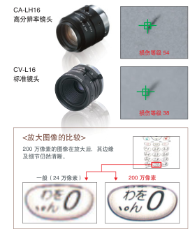 4 不同鏡頭性能造成對比度的差別右圖是使用本公司生產的高分辨率鏡頭 “CA-LH16” 和標準鏡頭 “CV-L16” 拍攝的同一物體的圖像。由于鏡頭的材料及構造的不同,造成圖像質量也不相同。根據用途選擇高分辨的鏡頭,可以得到高對比度的圖像。