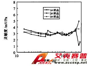 實(shí)驗(yàn)樣品采用北京信息工程學(xué)院研制的YLC-A型壓電式微壓傳感器,樣品數(shù)為3只。將傳感器安裝在測試腔蓋樣品架上,輸出端與腔蓋上的樣品輸出引線連接,扣緊腔蓋,按圖1所示連接系統(tǒng)。由于傳感器內(nèi)裝前置放大器,需提供直流電源工作,電源加在腔蓋上被測傳感器輸出端。調(diào)節(jié)信號(hào)發(fā)生器產(chǎn)生正弦信號(hào),信號(hào)幅度不宜過大,以避免傳感器輸出失真。選取多個(gè)信號(hào)頻率,分別測量每個(gè)頻率點(diǎn)兩傳感器的輸出電壓,在1kHz處示波器上的標(biāo)準(zhǔn)傳感器波形(1)的峰-峰值電壓為145.5mV;被測傳感器波形(2)的峰峰值電壓為5.85V。將V標(biāo)和V測代入式(1)算出被測傳感器的靈敏度。根據(jù)計(jì)算結(jié)果繪制傳感器的靈敏度隨頻率變化曲線,如圖2所示,從而得到傳感器的頻率響應(yīng)范圍。