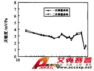 為檢測測量系統(tǒng)的重復(fù)性,實(shí)驗(yàn)對(duì)1#傳感器進(jìn)行了重復(fù)測量,圖3示出2次測量的靈敏度變化曲線。