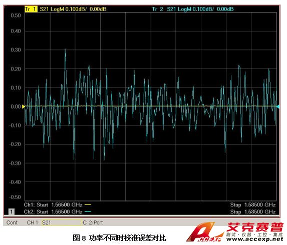完成雙端口校準后,直通連接。功率為-60dBm與-20dBm的校準誤差對比如圖8所示。