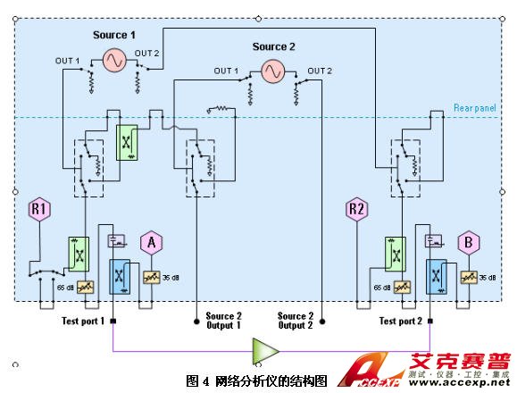 要想獲取高精度的測量結果,必須非常清楚地理解網絡分析儀的系統結構。安捷倫最新的網絡分析儀PNA-X的系統結構如圖4所示
