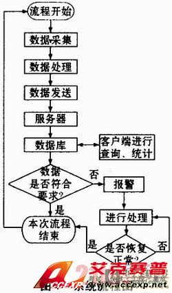 系統流程如圖4所示。針對不同的環境,根據需要采集的參數類型(溫濕度數據、煙感數據、煤氣感應數據等)選擇相應的傳感器,構成相應的傳感器子系統,傳感器子系統將采集到的數據經過處理后發送到服務器,服務器將接收到的數據自動存入數據庫,當數據超出規定的范圍時啟動報警器進行報警,提醒值班人員及時進行處理。值班人員也可以隨時通過客戶端軟件訪問服務器,對環境參數進行查詢、統計、生成報表,隨時掌握環境狀態。