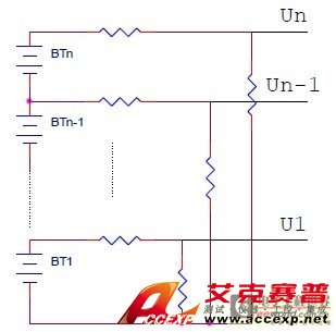 電阻分壓法主要是通過電阻分壓將實際電壓衰減到測量芯片可接受的電壓范圍,然后進行模數轉換。U1對應BT1 的電壓,Un-1 對應從BT1 到BTn-1 之間的電壓,Un 對應整個電池組的電壓,如圖1 所示。這種方法測量方面,成本低,壽命長,但是存在累積誤差,且無法消除。隨著單體電池數的增多,單體電池電壓測量誤差會隨著共模電壓的增大而增大。