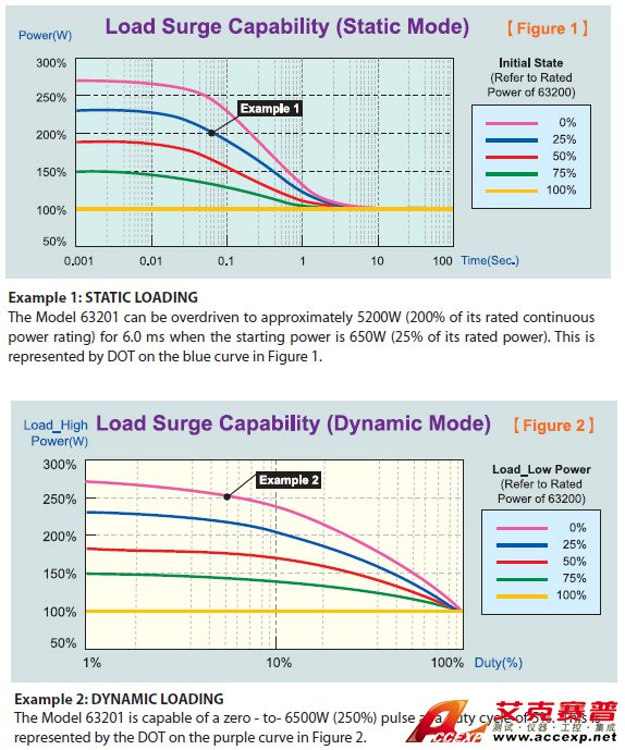 依據63200系列電子負載的初始負載情況,會有不同的浪涌 負載能力,如圖1與圖2的關系圖所示,圖中顯示的是初始負 載與可過載的最大負載能力與時間關系。當使用浪涌負載功 能時,如果超出圖1及圖2中所顯示的最大浪涌負載能力時, 電子負載會顯示過功率保護(OPP),并停止拉載。