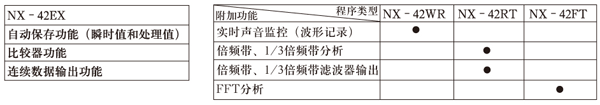 使用一些選項使儀表附加上如下功能:同時記錄原始[未處理]數據(100ms Lp)和處理過數據(Leq和其它指數),頻率分析和長期數據記錄。 當安裝上NX–42EX時,能添加上NX–42WR、NX–42RT和NX–42FT。 NX–42EX程序安裝后不能.卸載。