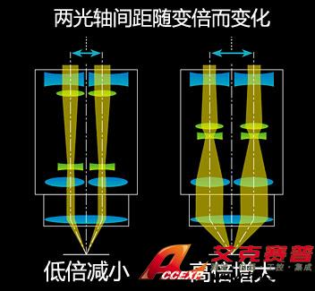 這是體式顯微鏡設計中的突破,完美變焦系統會在變倍過程中動態改變兩光軸間的距離。光軸間距離的變化可使每一倍率得到最大的進光量,使兩個光路獲得無妥協的高變倍比與高分辨率,同時還可修正整個變倍范圍中的光學誤差。此外這一突破性的光學設計還可將以上所有的特性整合在緊湊的機身中,讓體式顯微鏡同時滿足人體工學設計的需要。