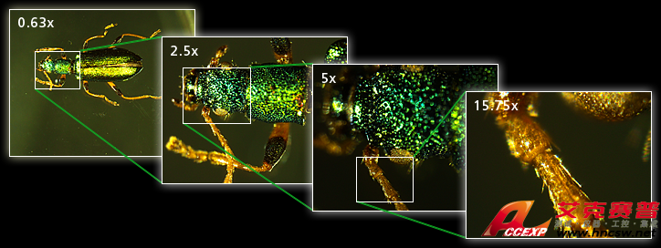 0.5X物鏡放大6倍觀察,切換到2X物鏡后系統自動變倍到1.5倍而保持3倍的綜合倍率
