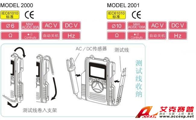 開口傳感器測量AC和DC電流可達60A(2000)/100A(2001)。 長條圖顯示3400讀數。 袖珍型,可吸收沖擊力的軟墊防震外殼設計。 自動關機功能可減少電池消耗。 設計符合國際安全規格 IEC61010-1 CAT.III 300V。 |