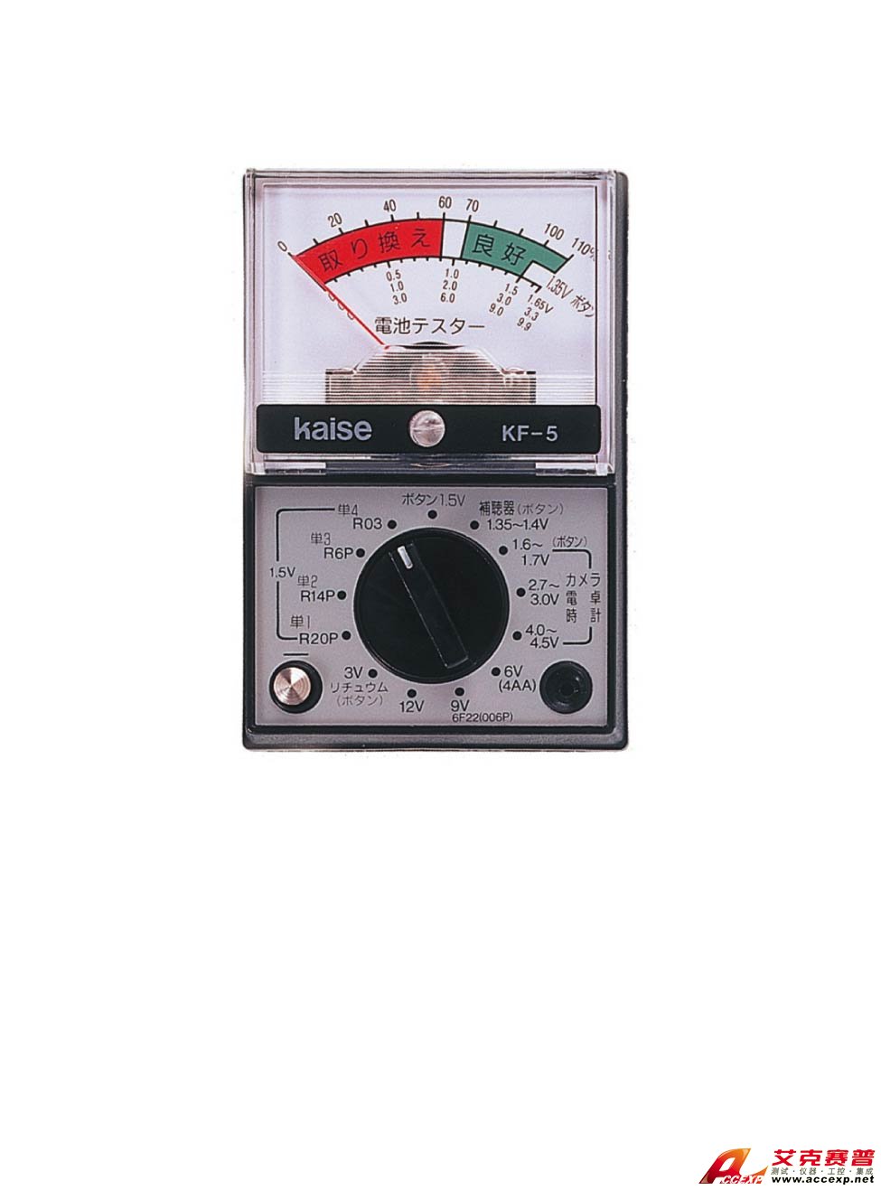 簡(jiǎn)介:日本凱世KAISE KF-5指針式模擬萬(wàn)用表詳細(xì)介紹 指針式模擬萬(wàn)用表KF-5 日本凱世KAISE KF-5指針式模擬萬(wàn)用表的參數(shù): 產(chǎn)品說(shuō)明: 電池測(cè)試儀表 產(chǎn)品參數(shù): KF-5 電池種類(lèi) 標(biāo)準(zhǔn)負(fù)荷 1.5V紐扣型 2mA 1.5V單4R...