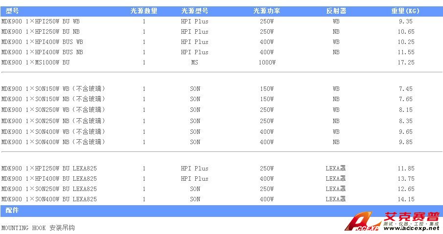 ●適合選配中低功率HID光源:150W、250W或400W HPI/SON,也可根據
