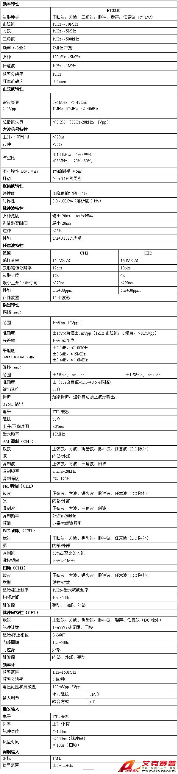 艾克賽普-ET3310雙通道函數/任意波形發生器技術參數: